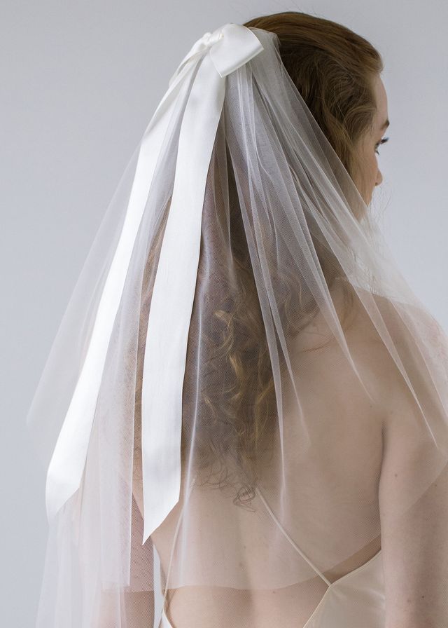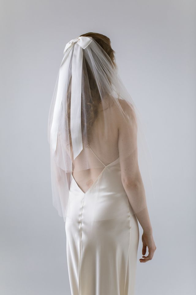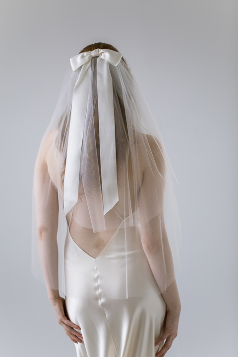 Inspired by visions of Brigette Bardot's famous bridal scene in the film And God Created Women. This feminine and delicate fingertip length veil has two layers of soft tulle. It's topped with long silk bow and sits on hair comb for easy and flawless placement.