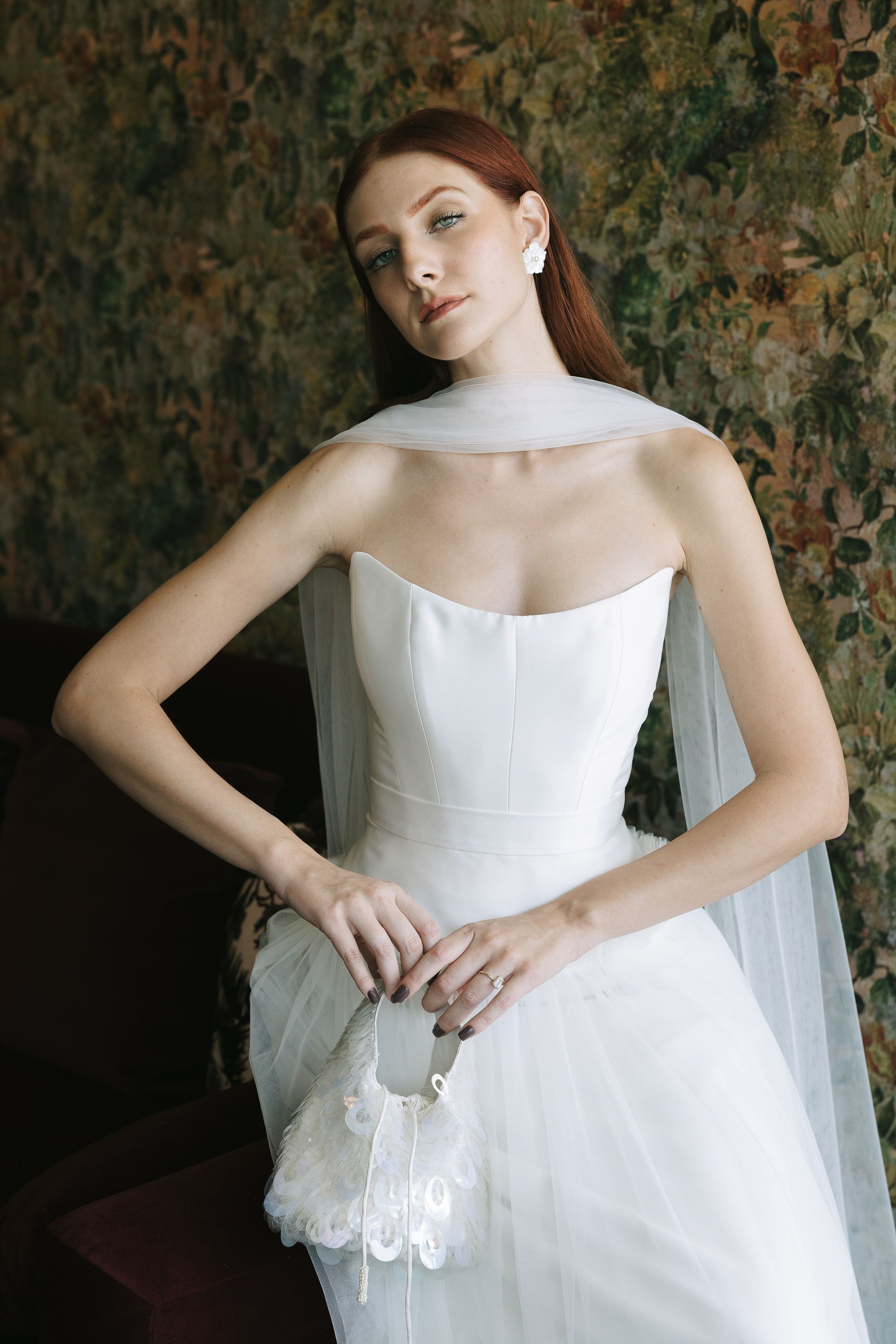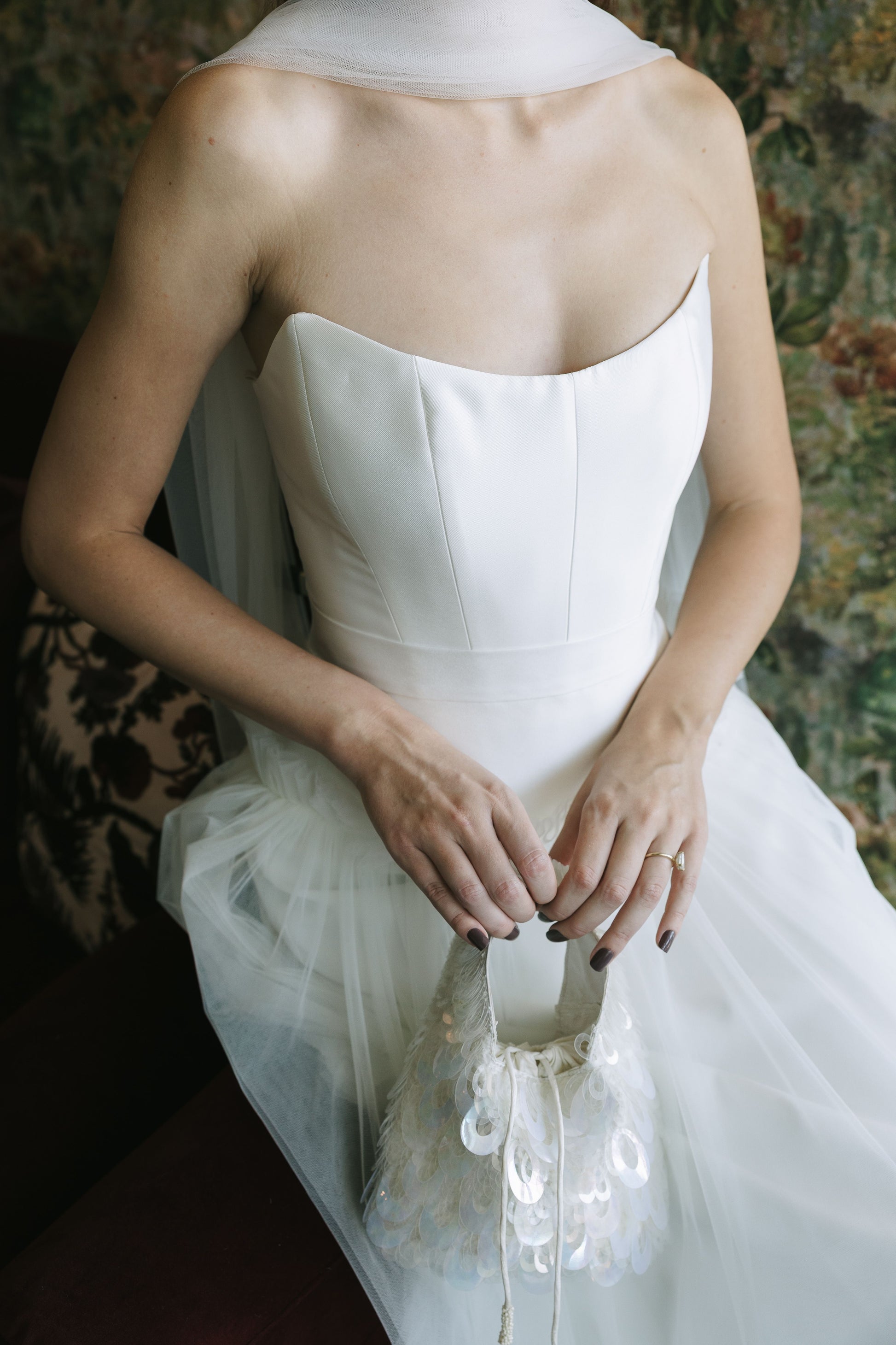 A little shimmer goes a long way. This delicate drawstring bag is covered in translucent sequins and soft feathered texture, catching the light with a pearly sheen. The perfect finishing touch for rehearsal dinners, reception looks, or wedding day essentials, all wrapped in a whisper of sparkle.