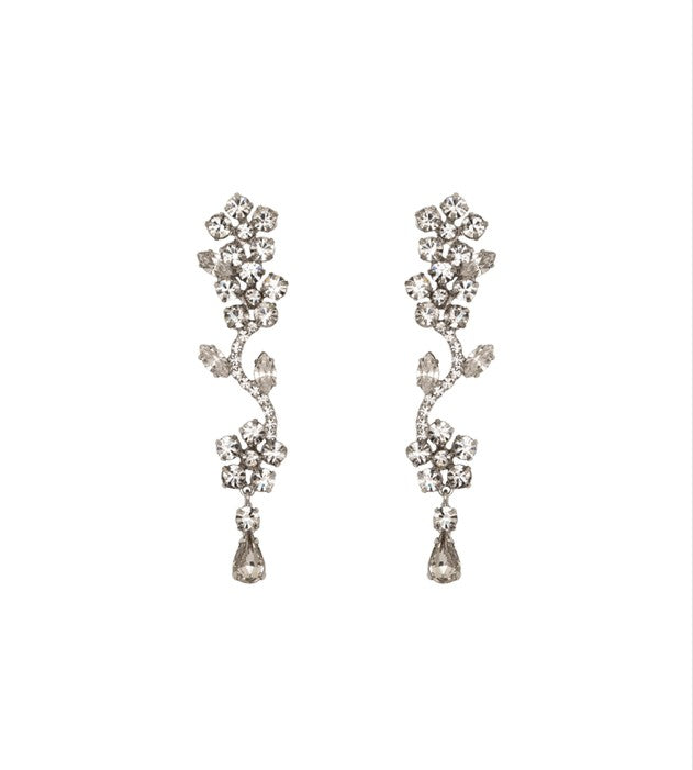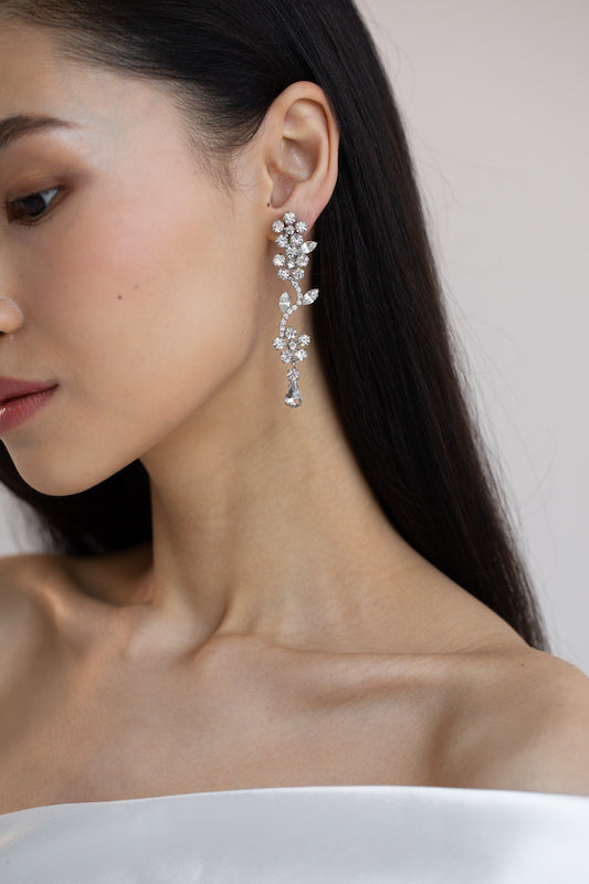 Delicate blooms, endless sparkle. The Dania Earrings feature cascading floral rhinestones that catch the light with every turn. Designed to mimic a graceful vine, these drop earrings bring vintage glamour with a modern twist — perfect for a candlelit ceremony or celebratory soirée.