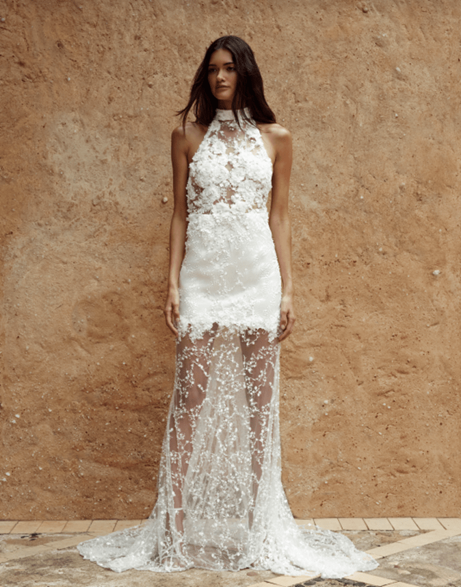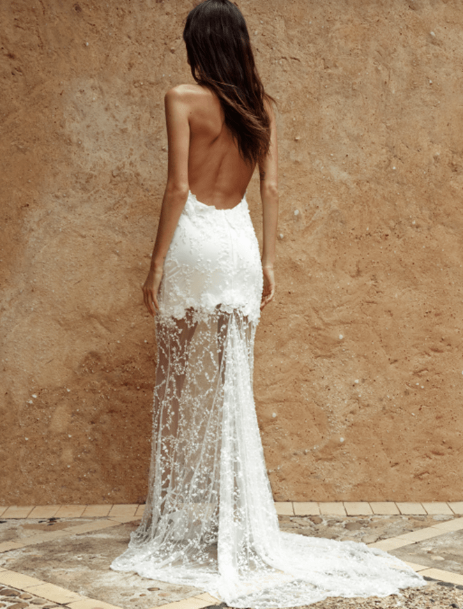 Description: for the elegant but daring bride; A column silhouette that frames the figure crafted out of a soft tulle with intricately beaded vine-like clusters with a halter neckline leaving the gown completely backless with a cathedral length beaded train.