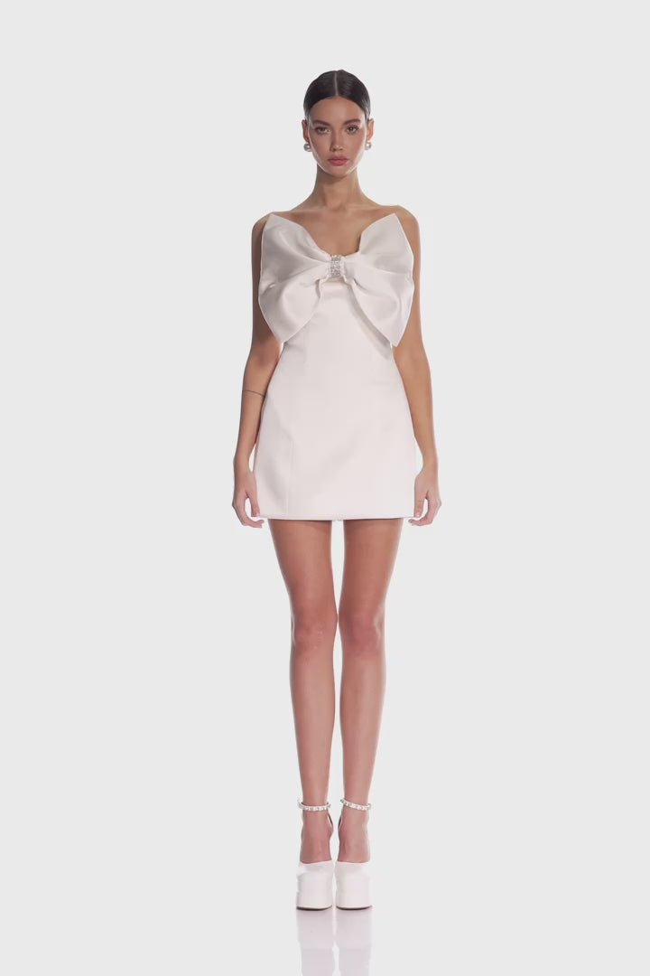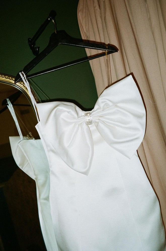 All tied up and ready to party. The Evie Mini is a satin showstopper featuring a structured fit and an oversized bow that brings the drama. Clean lines, crystal detail, and just the right amount of flirt — she’s made for ceremonies, city hall vows, or your second outfit moment.