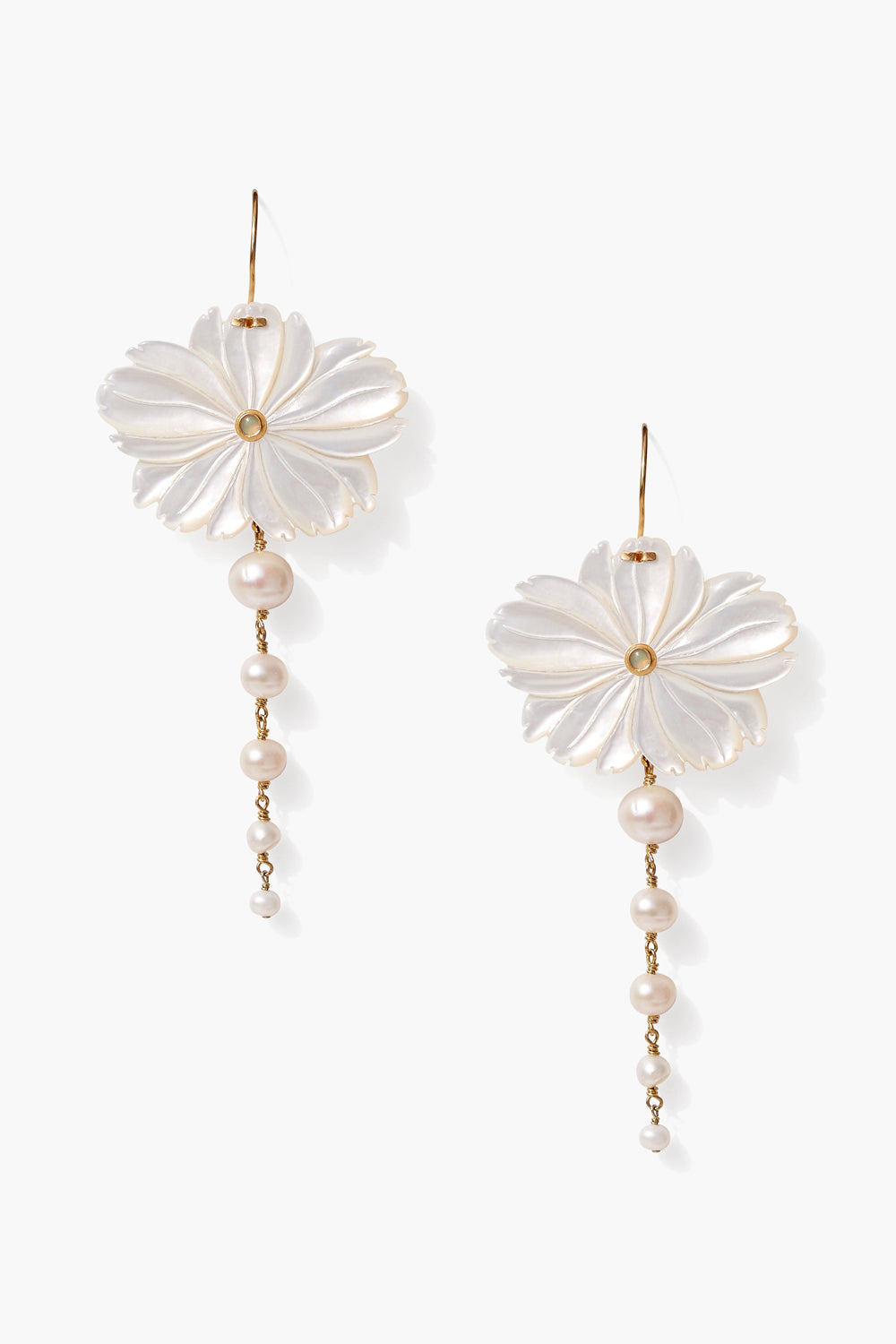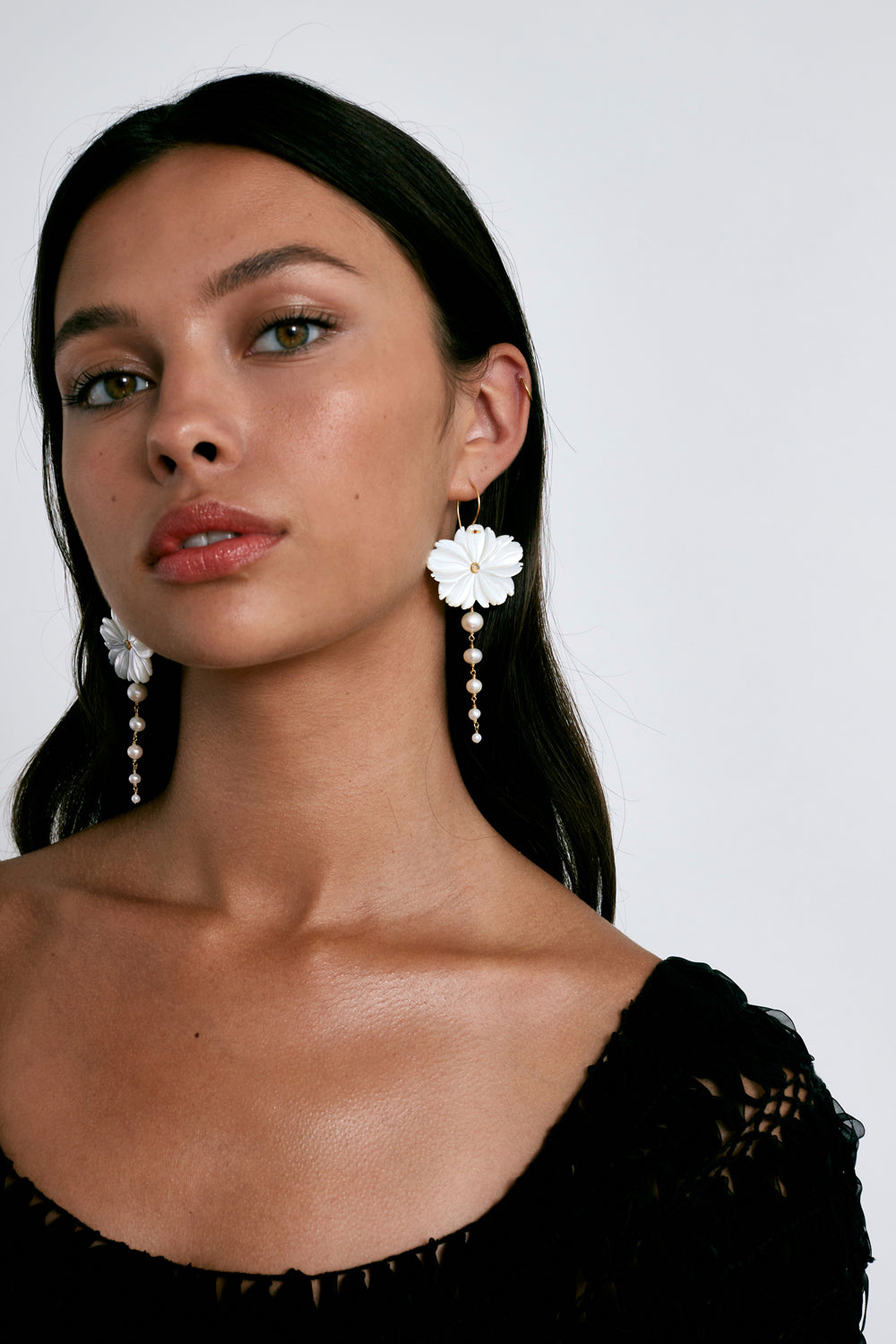 Romantic and ethereal, these Floral Drop Earrings are the perfect finishing touch for a modern bride. Delicately sculpted white blossoms bloom at the ear, while a graceful cascade of lustrous pearls adds movement and timeless elegance. Light yet striking, they bring a fresh, feminine charm that pairs beautifully with bridal gowns and after-party looks alike.