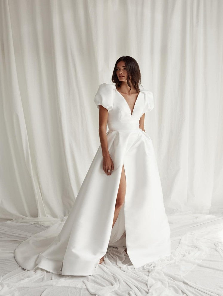 Description: Bold & sophisticated sculptural sleeves which lend drama to the deep v-neckline. A delicate dot trim adorns the neckline and the skirt of the gown has a high slit. Made of Mikado/twill. Boning throughout the waistline for added structure and support.