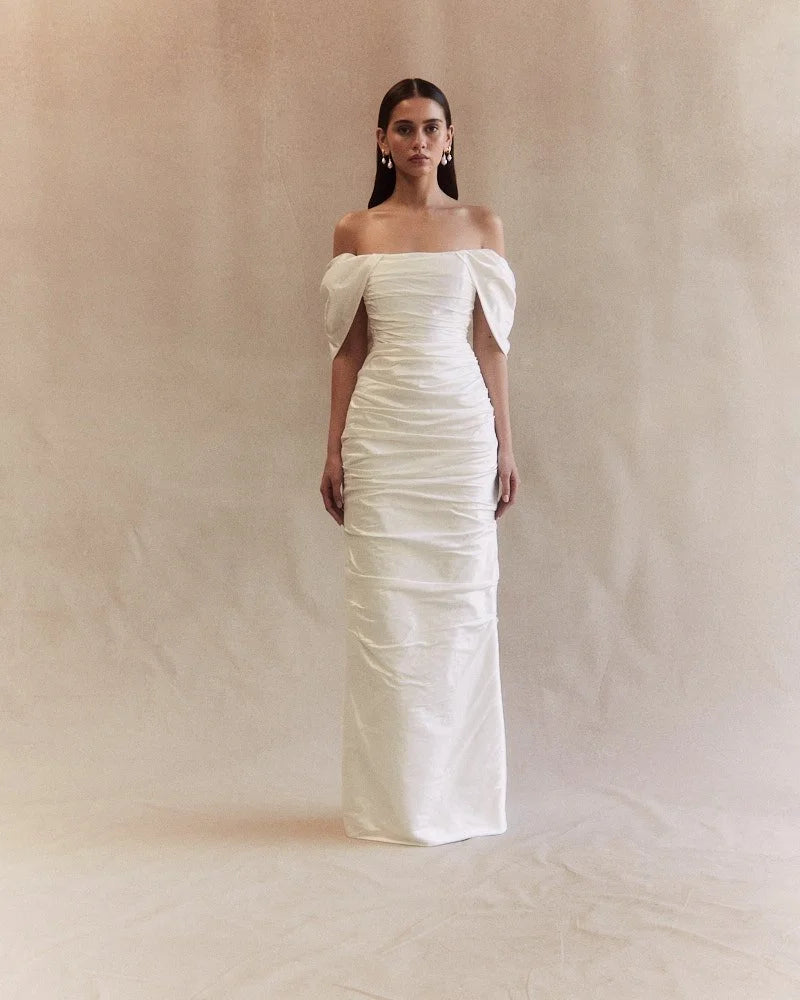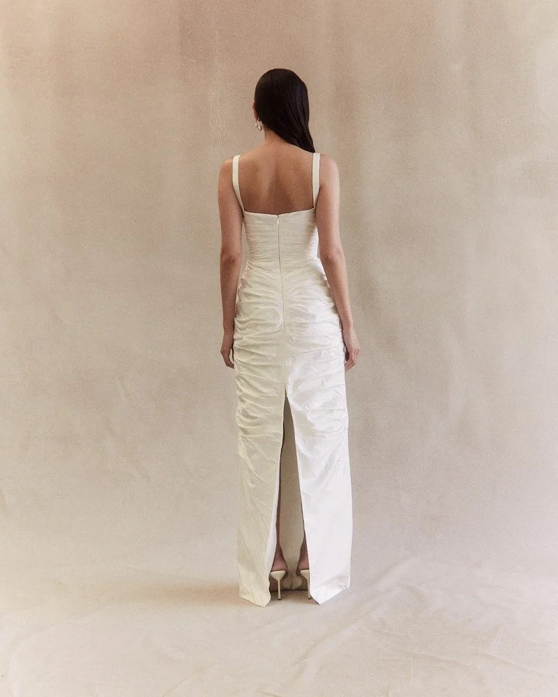 Walk down the aisle in this perfect column textured dress. Its sleek column silhouette falls into a floor-length skirt with a subtle centre-back split, offering ease of movement while maintaining a refined shape. The detachable voluminous sleeves add a touch of drama, allowing brides to seamlessly transition from ceremony to reception with two distinct looks.