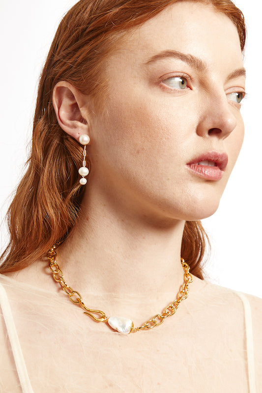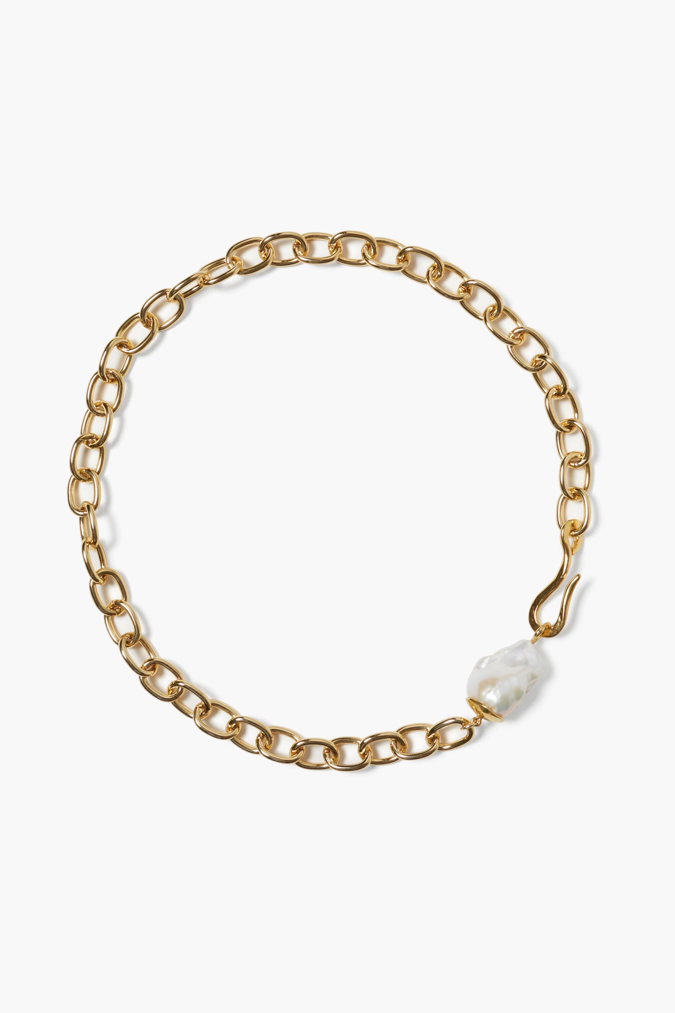 Sleek and contemporary, the Goldie Pearl Necklace features a bold gold chain finished with a sculptural pearl accent. The luminous pearl adds a touch of organic elegance, beautifully contrasting with the polished links for a modern yet timeless design. Secured with a distinctive hook clasp, this piece is perfect for layering or wearing solo as a refined statement.