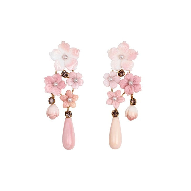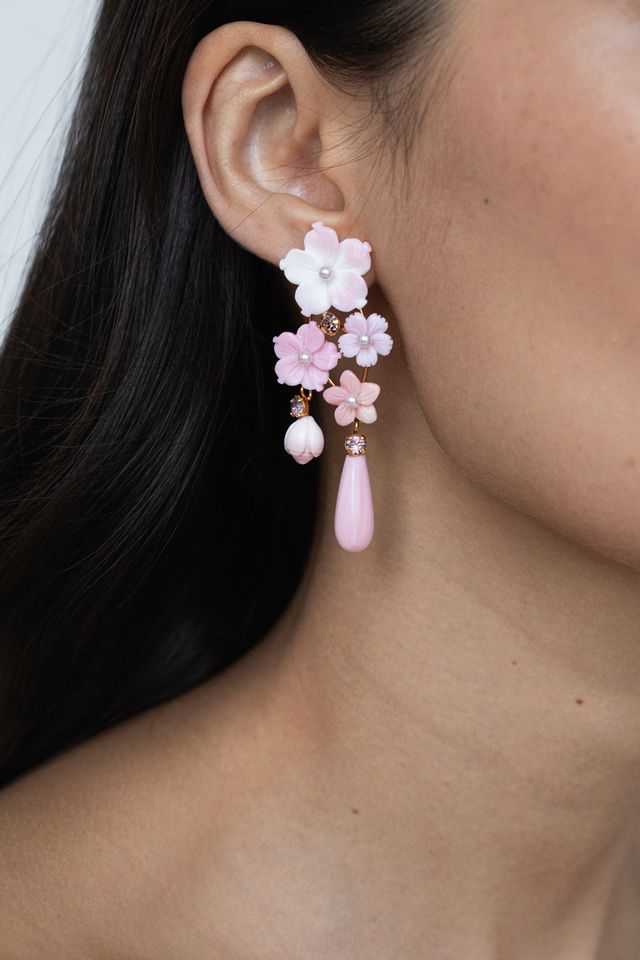 A floral love story in every detail. The Jeannie Earrings are handcrafted with delicate rose-hued blossoms, pink crystal accents, and soft teardrop beads for a look that’s as romantic as it is refined. Their antique rose tones pair beautifully with blush gowns, prairie lace, or a windswept veil.
