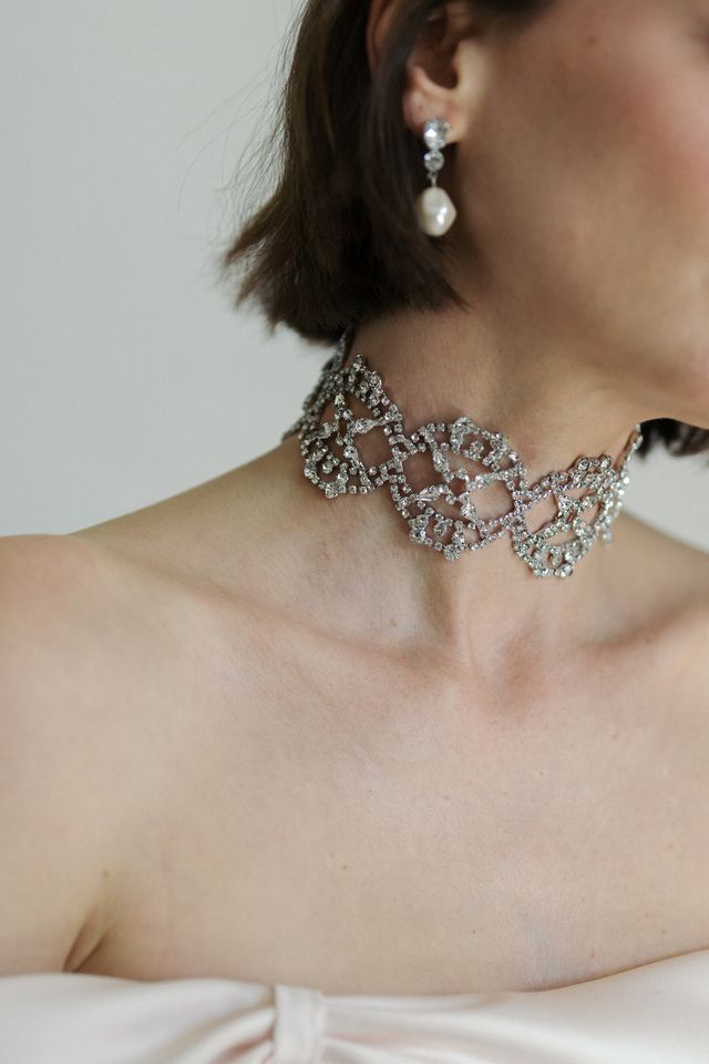 Make a statement of timeless elegance with the Lavinia Choker. Adorned with shimmering rhinestones, this piece evokes a vintage-inspired glamour while maintaining a contemporary edge. The delicate, lace-like structure hugs the neckline gracefully, creating a dramatic effect.