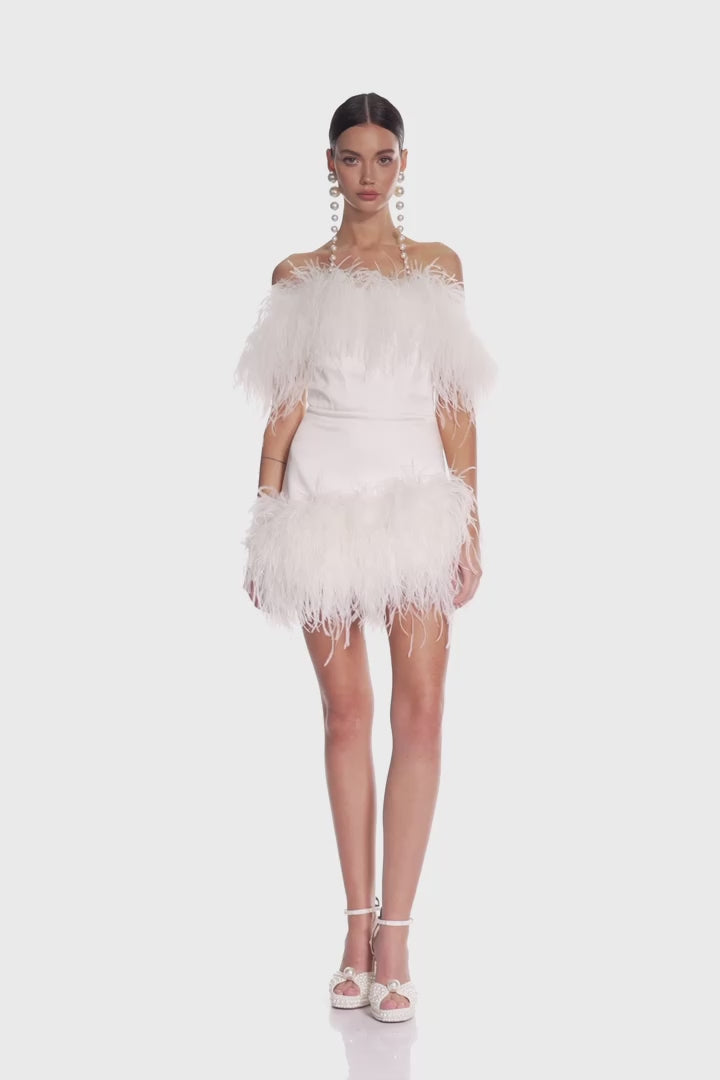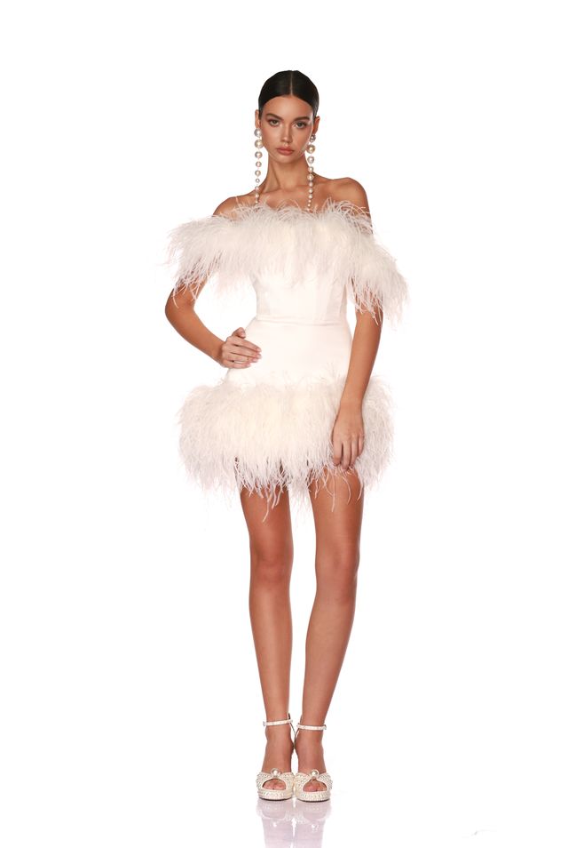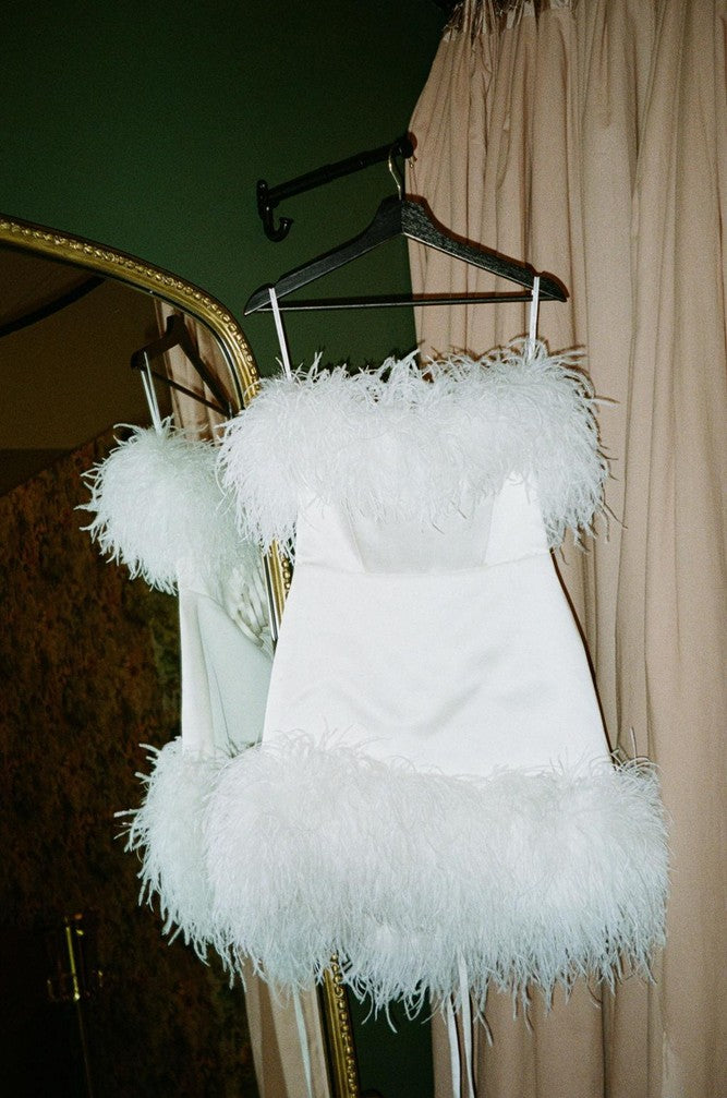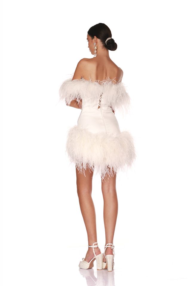 She’s here for the spotlight. The Lola Mini is a strapless stunner trimmed in dreamy white feathers, featuring an asymmetric skirt and a corset back that cinches to perfection. Equal parts glam and flirt, this dress was made for champagne pops, flash photos, and dance floor drama.