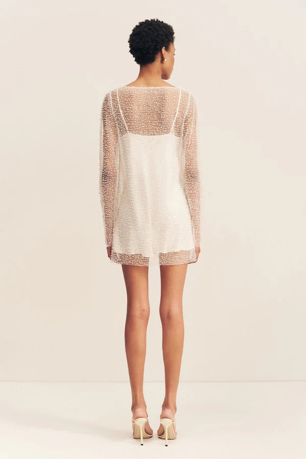 Dazzle in the London Iridescent Mini. Designed for the bride who loves a fashion-forward twist. The clean, minimalist silhouette is elevated with a sheer overlay adorned in delicate pearls, creating a soft shimmer that catches the light with every move. Perfect for a rehearsal dinner, after-party, or any bridal event.