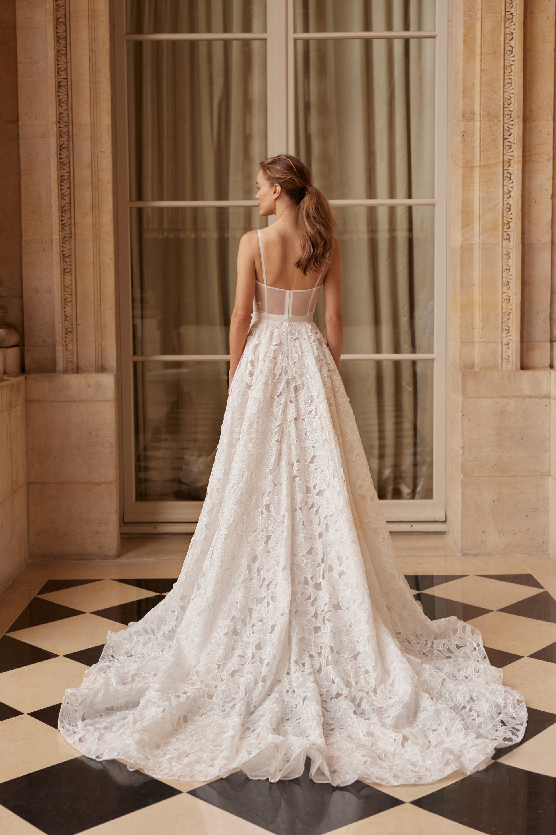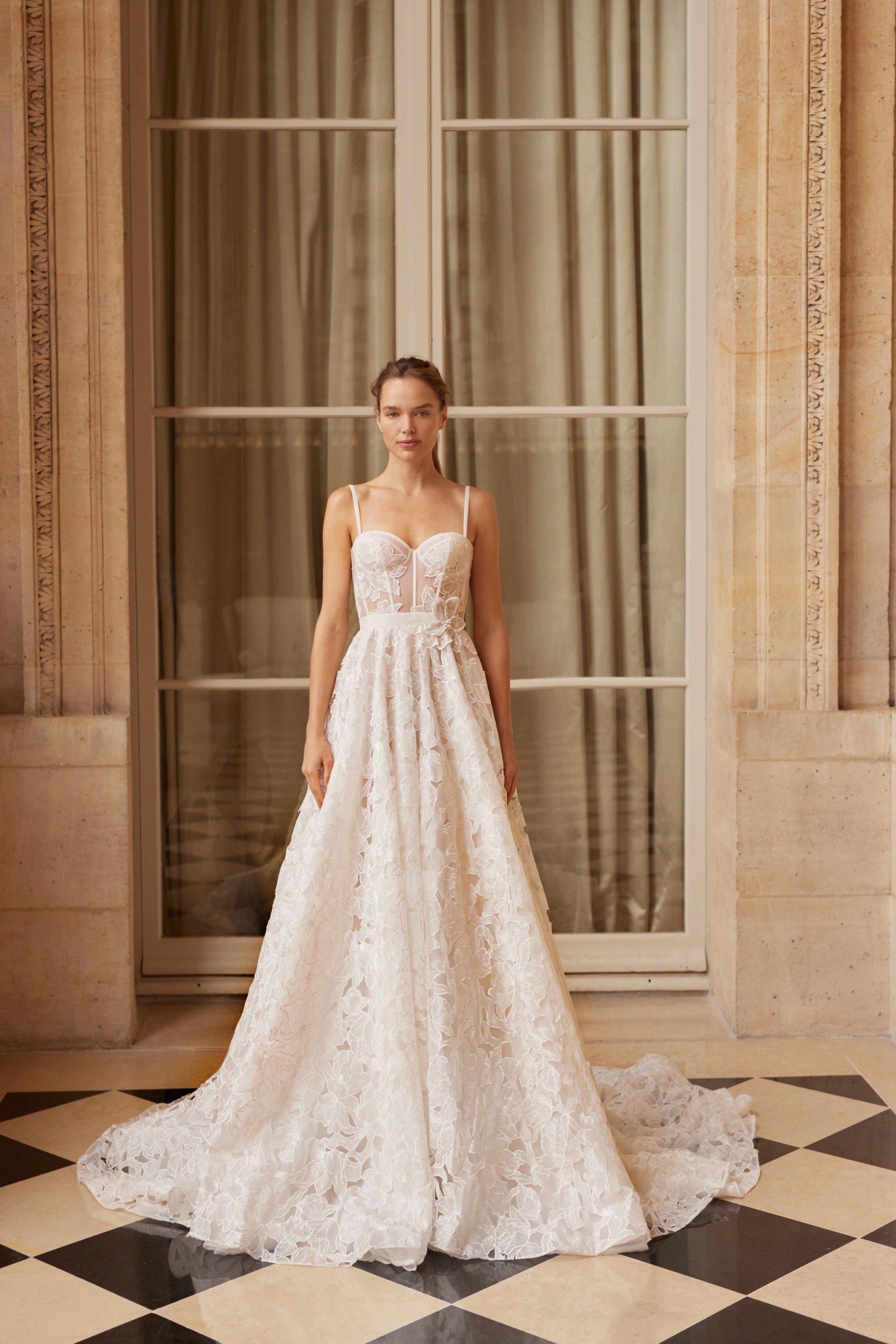The Madison gown is perfect for any bride. This is a corset gown with thin velvet straps and a flowy skirt, all made of large floral lace. This gown is ideal for your special moment.