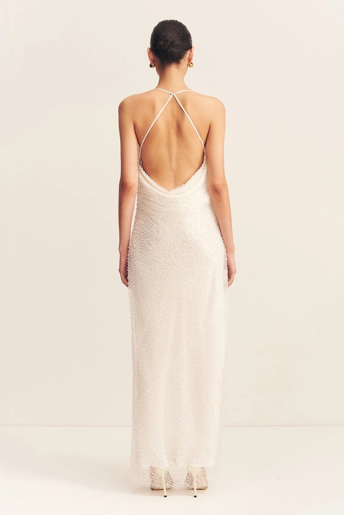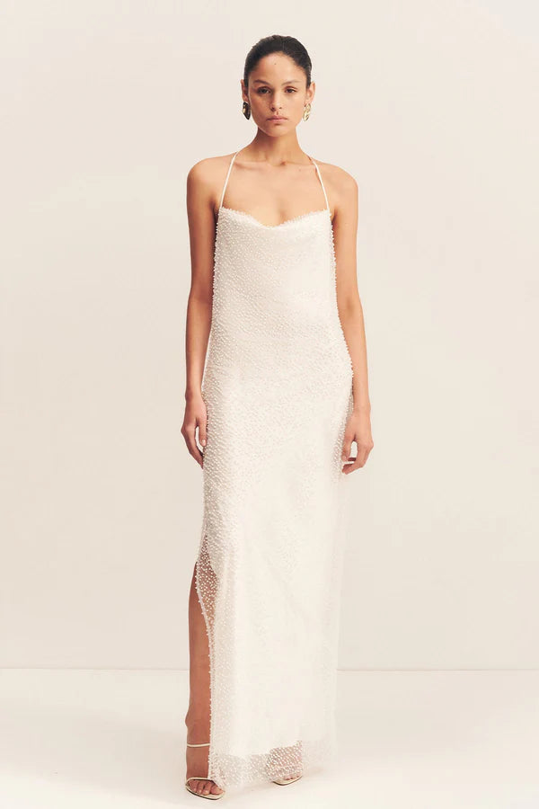 Radiate modern elegance in this luminous Maggie Dress, designed for the bride who loves understated glamour with a touch of allure. Featuring delicate spaghetti straps and a graceful cowl neckline, this dress drapes effortlessly over the figure for a refined, minimalist silhouette.
