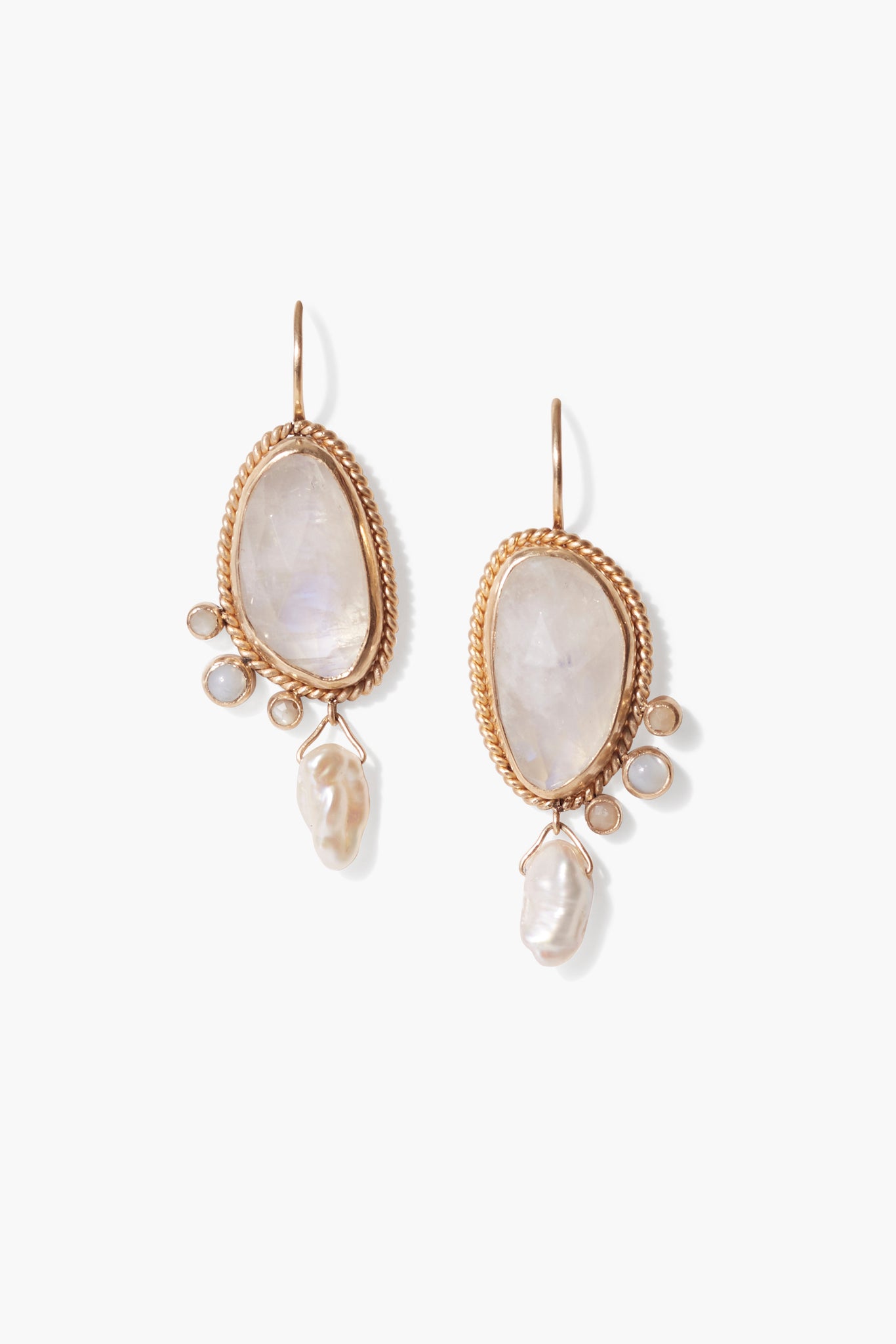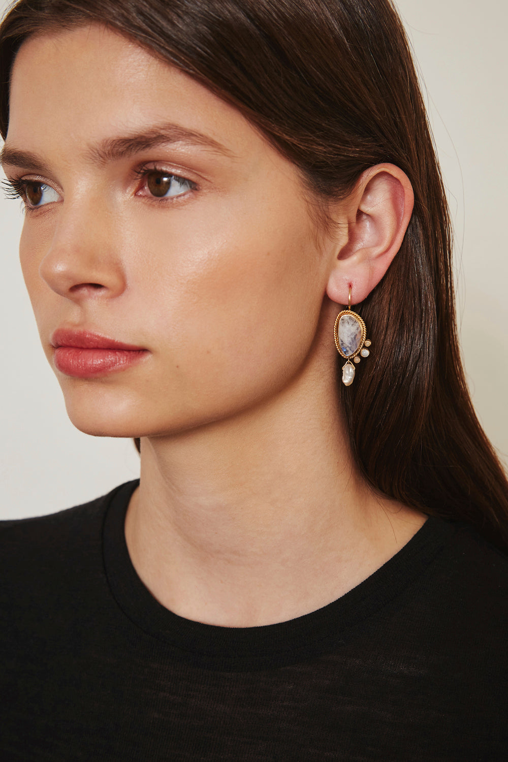 Romantic and ethereal, these Moonstone Drop Earrings are designed to capture light—and hearts. Featuring luminous moonstones framed in delicate gold with cascading freshwater pearls, each pair evokes a sense of timeless elegance and natural beauty. A perfect finishing touch for brides who want to radiate grace and individuality on their special day.