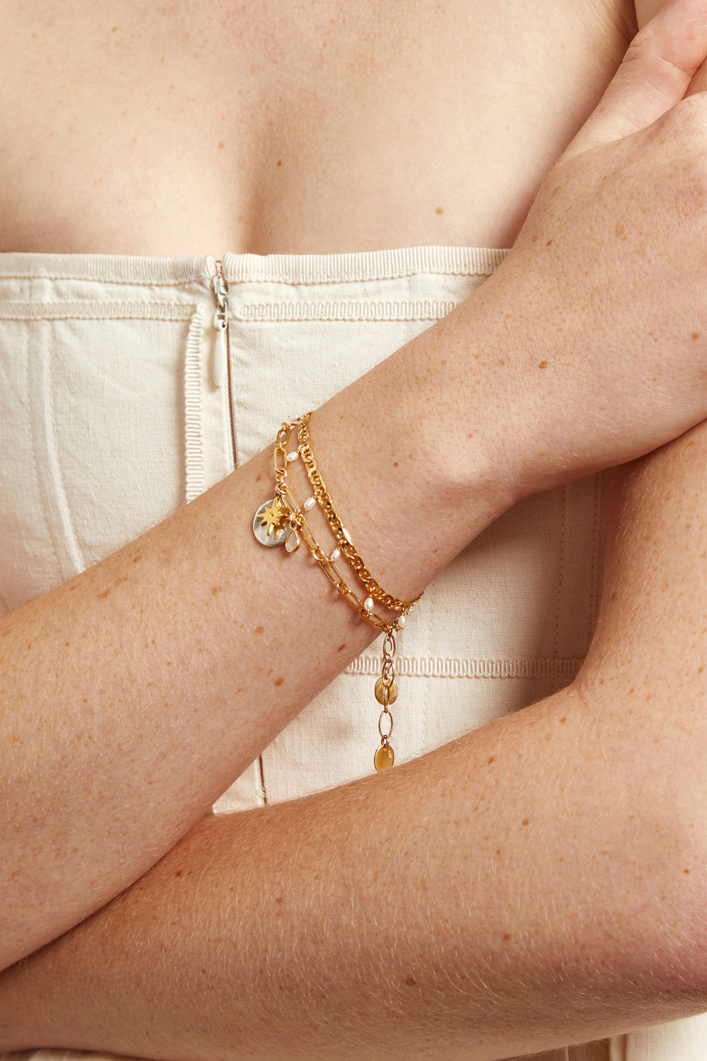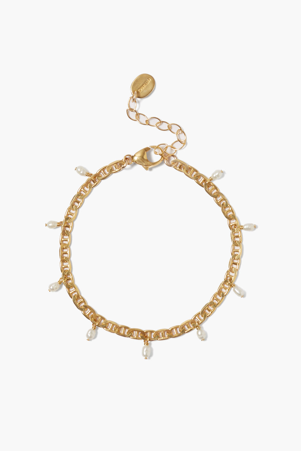 Elevate your bridal style with this delicate gold-tone chain bracelet, adorned with dainty freshwater pearl drops that add a touch of timeless elegance. This is the perfect accessory for your big day.