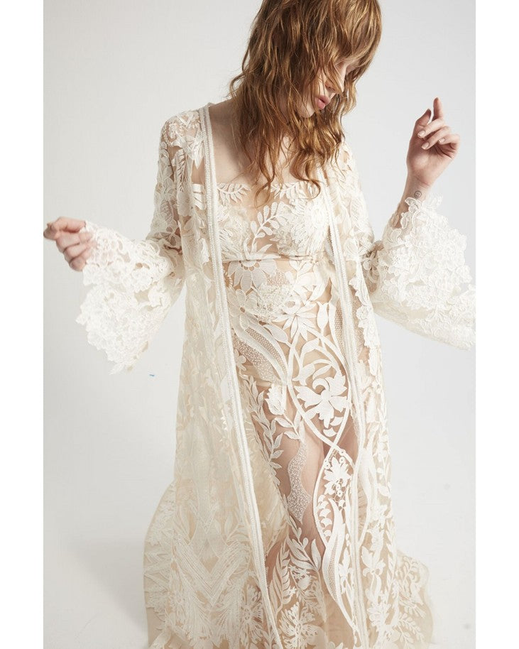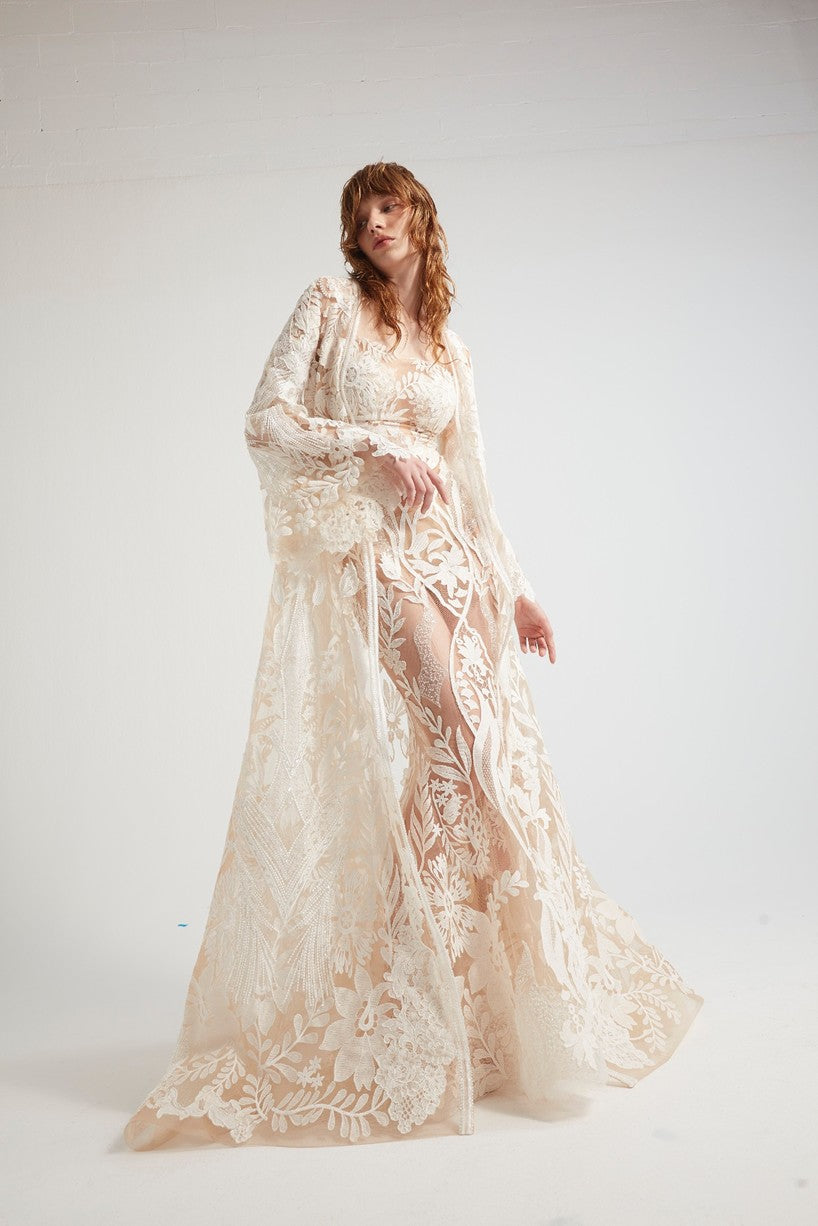 Description: for the boho bride. A sheer, mermaid dress with Bardot neckline and long, fitted sleeves. The gown has delicate floral motifs that seem to be tattooed on the bride’s skin. The matching Nigella jacket gives it a romantic and elegant touch with a long train.