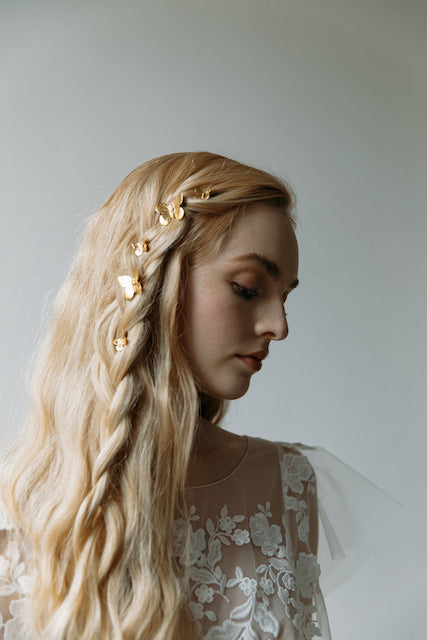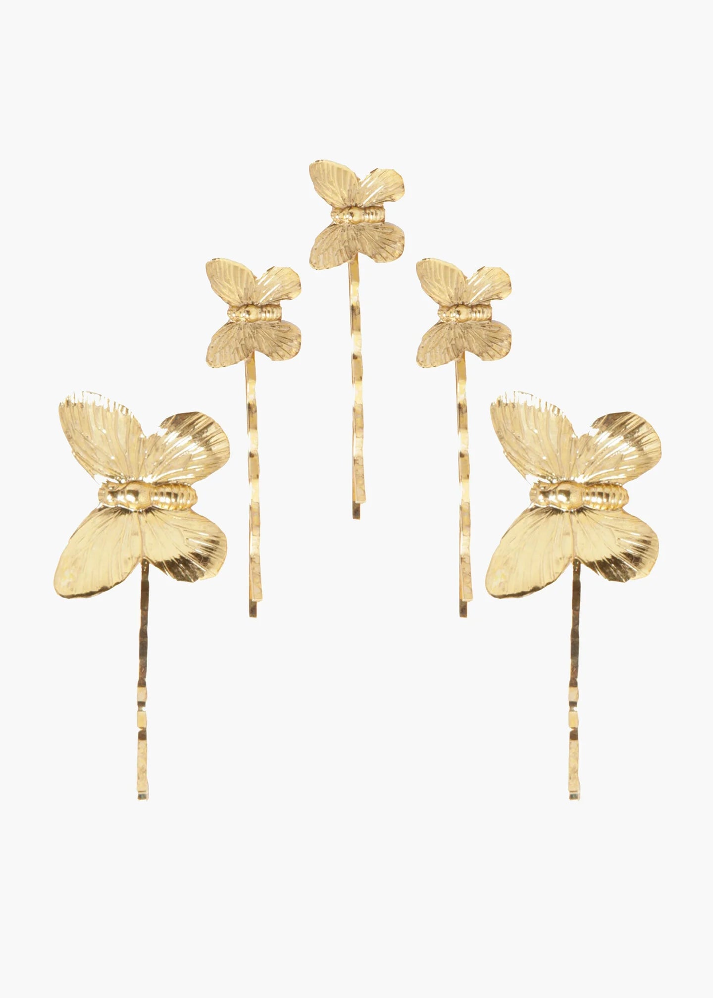 The perfect detail, our Pippa Bobby Pin Set is the ideal accessory. This set of five is comprised of sprightly golden butterflies of different sizes, complete with intricately etched details.