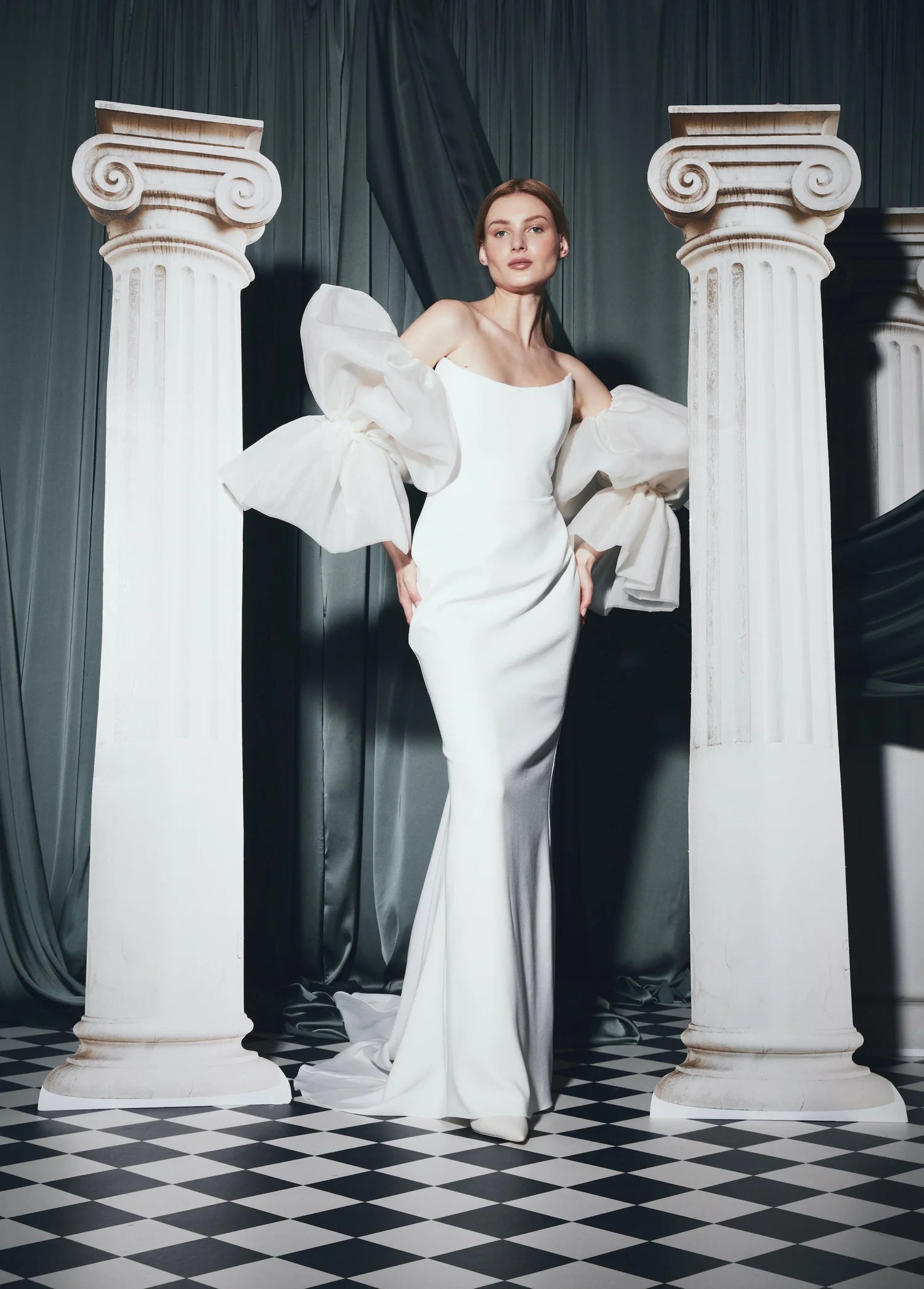 Finished with the perfect statement sleeves, this accessory brings a touch of drama to timeless elegance.